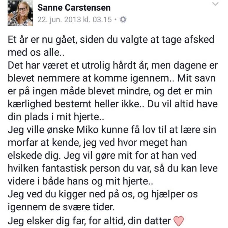 Da det fĂžrste Ă„r var gĂ„et, skrev jeg denne status pĂ„ facebook. Jeg har skrevet mange opslag om mit savn til ham – bĂ„de pĂ„ facebook og instagram, jeg har ogsĂ„ skrevet blogindlĂŠg omkring.